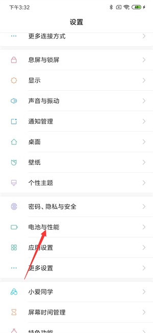 首先进入手机的【设置】->【电池与性能】