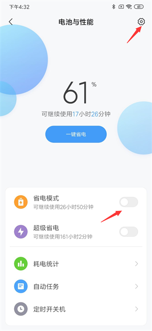 关闭省电模式,再点击右上角的设置。