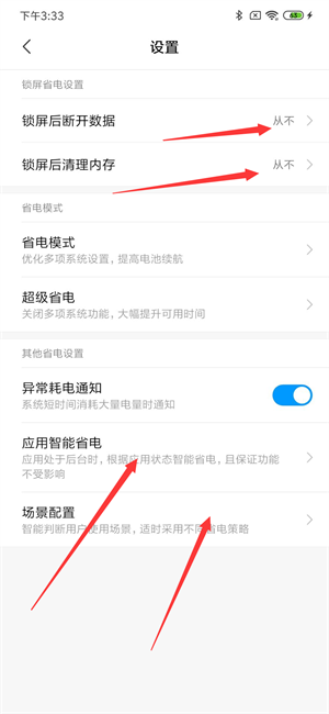 设置锁屏从不断开数据和从不清理内存。
