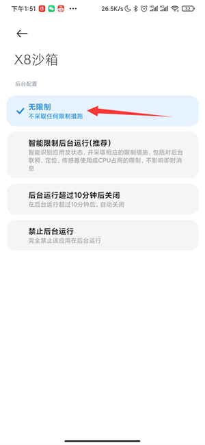 再进入应用智能省电,找到X8沙箱,设置无限制