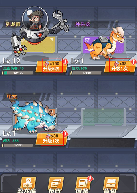 4、玩家可以提升恐龙等级,增加其战斗力,但是首先需要提升主角等级,因为恐龙等级不能超过主角等级哦!