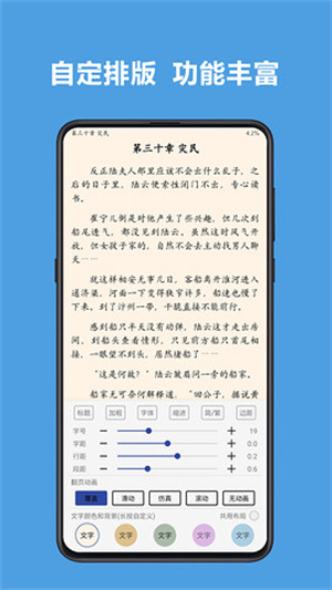 7.支持高度自定义阅读界面,切换字体、颜色、背景、行距、段距、加粗、简繁转换等。