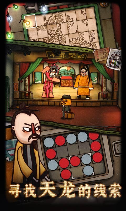 14.来到剧院之后点击台上的演员,他让我们进道具室找到道具师,进门密码是一个加法游戏,非常简单,进去之后我们把铁丝和绳子给他,然后,点击左下角的箱子,密码为上方两个朝下,下方两个成外八字(如箭头所示)完成离开拿到一根摇杆,回到包子铺前,往右边走。