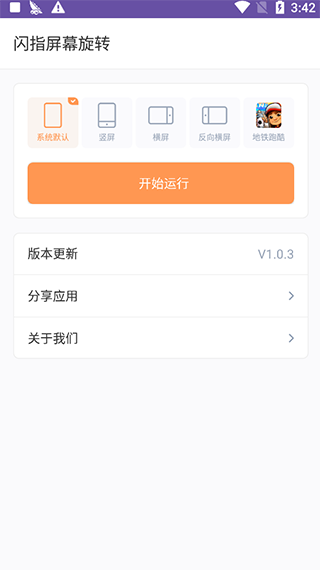 闪指屏幕旋转app是广州米鹿网络科技有限公司为地铁跑酷玩家量身定制的一款屏幕旋转工具,无需复杂操作,只需轻触即可一键设定屏幕方向。该应用特别针对地铁跑酷设计了专属屏幕旋转功能,无论是标准版、国际版还是特殊版本,均可实现一键设置,并会随游戏版本更新而调整,确保随时可旋转。此外,闪指屏幕旋转app不仅支持横屏模式,还兼容竖屏和反向横屏等多种操作,简单快捷的界面让即使是新手也能轻松上手。感兴趣的玩家不妨下载体验一下!