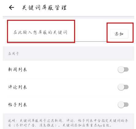 4、在这里就可以将自己想要屏蔽的关键词填入,逐个添加即可,然后下面有三个栏目,选中自己不想显示的板块就行了。