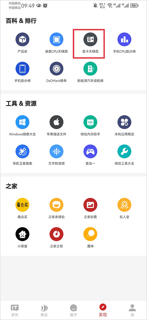1、在发现界面中为用户提供了百科排行、工具资源、之家三大类功能,在百科排行功能中点击显卡天梯图