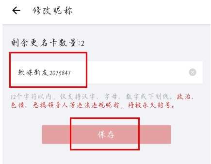 4、最后将要修改的名字填入保存就完成啦。(提示:更改名字有限,请谨慎修改哦)