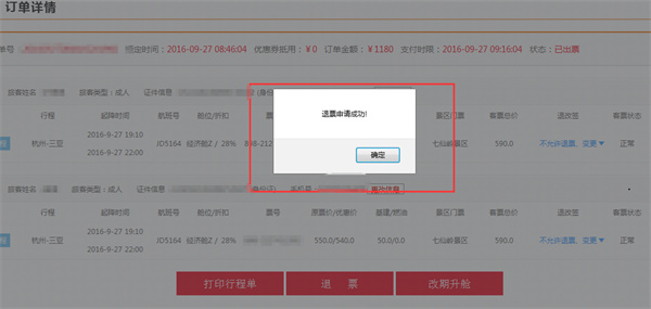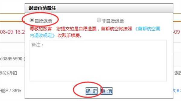 6、选定退票原因,点击“确定”按钮后,即已成功提交非自愿退票。继续点击“确定”按钮即已完成非自愿退票操作。