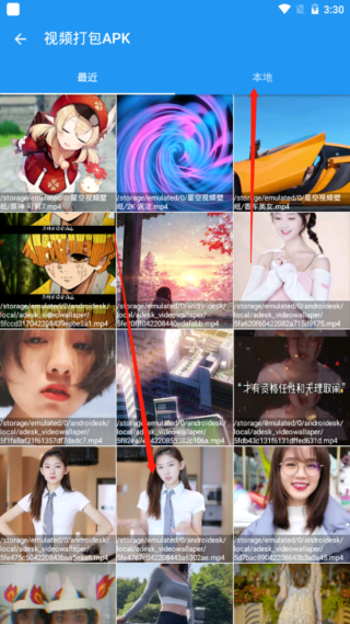 4、这时候我们就来到了手机相册中的本地视频,就可以选中你需要分享的视频壁纸,同样用户也可以在上方点击“本地”,在自己手机中的存储位置来寻找到指定的视频文件。