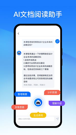 通过提问AI助手,获得指定文档所需信息,包括不限于文件主旨梳理、文章大纲制作、表格形式展示文件数据。支持PDF、Word、Excel、PPT等格式。