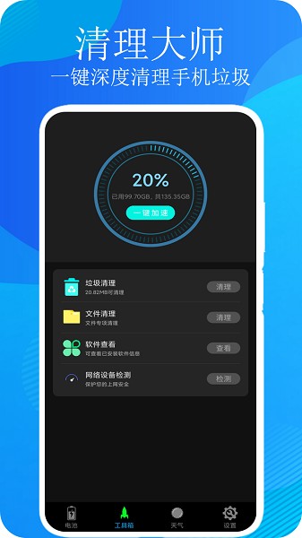 手机清理王2024年新版正版允许用户自由清理手机中的垃圾文件,可以根据需要加速手机运行,并使用各种工具。平台还支持专项清理,可以单独清理某一类文件,操作非常便捷。