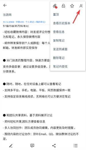 3、成功保存笔记内容之后,再次点击查看笔记内容,用户可以通过右上角按钮唤起功能列表,或者使用底端的菜单里的各项服务。