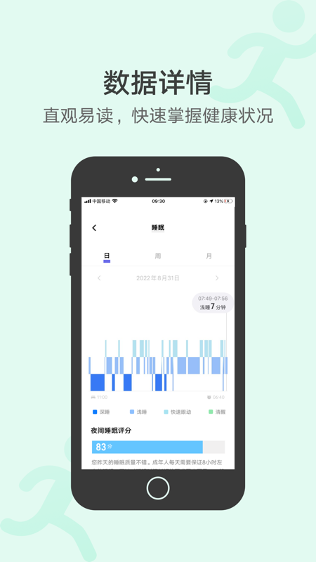 3.记录你的日常睡眠状态,包括深度睡眠、轻度睡眠、快速眼动和清醒时间,并对你的睡眠状态进行评分。