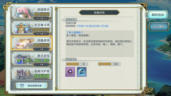 扭曲战场每周二、周四、周六都会限时开启,早晚都可以参与~每个时间段可以参加一次,每天的第一次参加奖励翻倍。