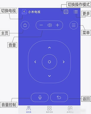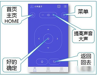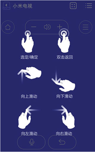 3、点击“小米电视(192.168.1.37)”,可以看到悟空遥控的主界面,非常简洁。常见的选择键、确定键、菜单键、主页键、返回键、音量键。下方是功能选择栏。右上方分别是切换手势遥控器和更多设置按钮