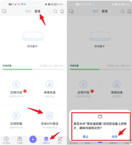 下面就是通过手机往电视中安装应用的步骤了,想要安装的应用要提前下载好(不用安装),注意要记得下载文件的保存位置。手机应用下载好之后,回到手机端的“悟空遥控器”应用中,以此点击:应用中心——管理——本地APK推送,这个过程就是把手机本地的应用推送至电视中,可要选择“允许”应用访问我们手机设备文件哦!