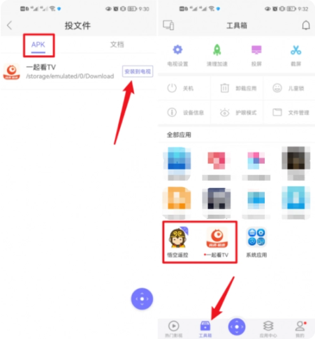 最后在投送文件界面中,大家直接点击刚刚手机下载好的文件“安装到电视”即可,电视会自动的进行同步安装,我们在悟空遥控器应用的“工具箱”中也可看到已安装成功的电视应用。