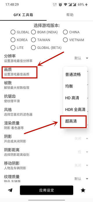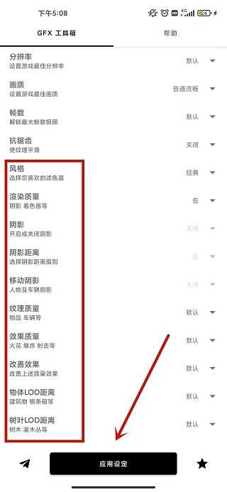 5、此外在gfx工具箱内还可以设置抗锯齿、阴影、纹理等多种数据修改,在设置完成后,点击底部“应用设定”既可开始体验啦!