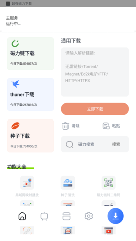 打开超强磁力下载首页,可以看见有磁力下载、thuner下载、种子下载、http下载、FTP下载等等,还有磁力转二维码、本地种子扫描、种子清晰等工具。