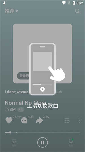 2、音乐的切换则是和抖音短视频一样,采用手动上下滑屏的方式,这也是目前视频音乐App主要的歌曲切换方式。