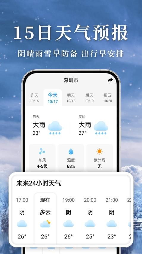 精准雨晴 天气应用 最新版本是款辅助用户在线查阅天气预报信息的工具。通过在线查询天气预报信息,为用户日常生活提供便捷服务,同时也能让用户提前规划行程,确保出行顺畅。该应用提供的天气状况信息均源自权威数据源,保证了信息的准确性,使用户能获取到精确的天气预报,并支持未来15天的天气查询,让用户能提前了解接下来多日的天气情况。每小时更新的天气报告让用户掌握一天24小时内的实时天气详情,还可以了解到空气质量、气压、湿度等详细气象信息。有需求的用户快来下载精准雨晴官方版应用体验吧!
