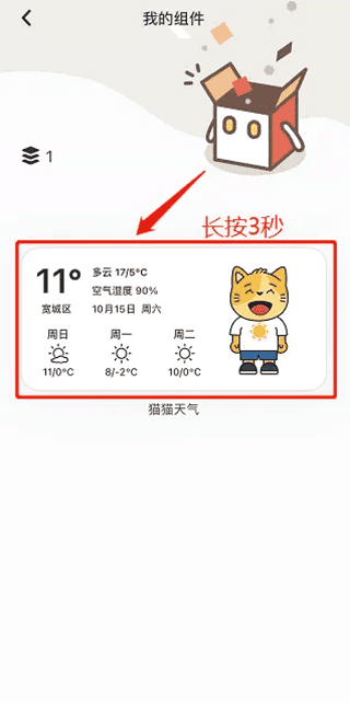 2、进入我的组件界面后,长按【猫猫天气组件】5秒