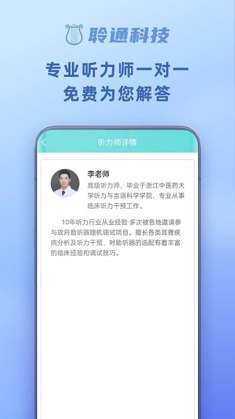 聆通助听器APP能帮助用户迅速连接智能助听器,实现各种控制需求,使日常聆听更加清晰。该应用还提供了在线听力测试工具,可即时检查听力状况,并设有专家咨询服务,用户可以就任何听力问题进行咨询。