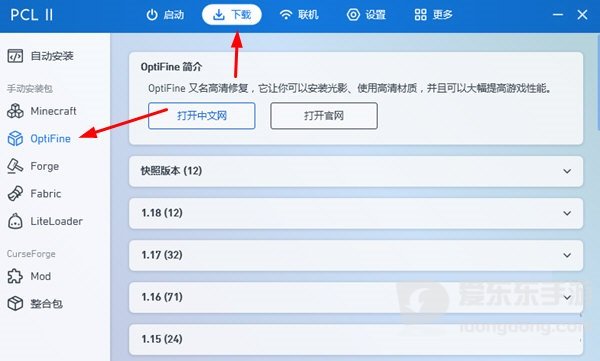 第一步:首先我们需要在【下载】栏目中,安装下载【OptiFine】,这个就是光影的必备组件。这里选择自己游戏的对应版本即可,注意一定要对应版本。