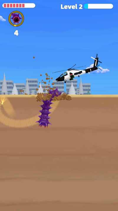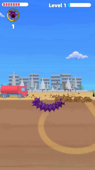玩家操控一只巨大的变异虫子,它会吞噬并摧毁所有障碍。一旦达到危险级别,人类会视你为威胁,派遣军队和直升机对你进行攻击,发射导弹。因此,玩家可以藏身于地下以避开导弹,伺机进行反击。
