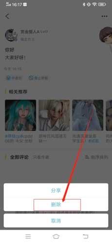 4、最后在弹出窗口中选择“删除”,即可成功删除帖子