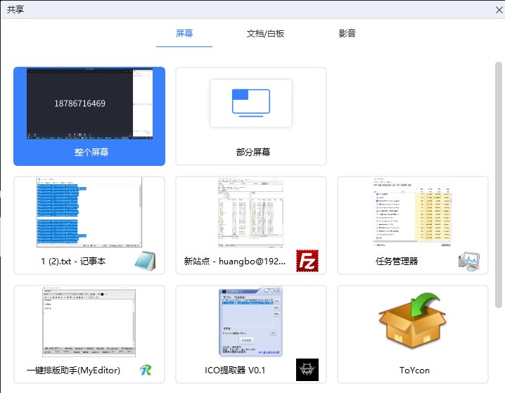 9、提示屏幕共享功能,直接在软件界面点击一个已经打开的窗口立即共享
