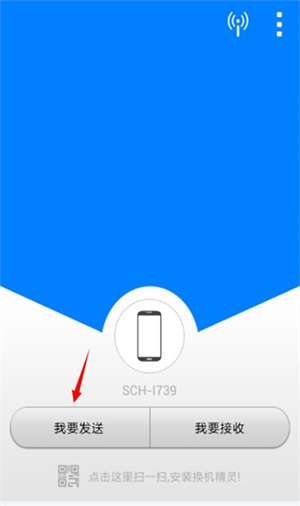 2、画面比较简单,有简单的个人喜好设置,不影响文件的传送功能,软件使用的wifi零流量文件转移。打开旧手机里的换机精灵,选择“我要发送”功能,进入选择文件界面。