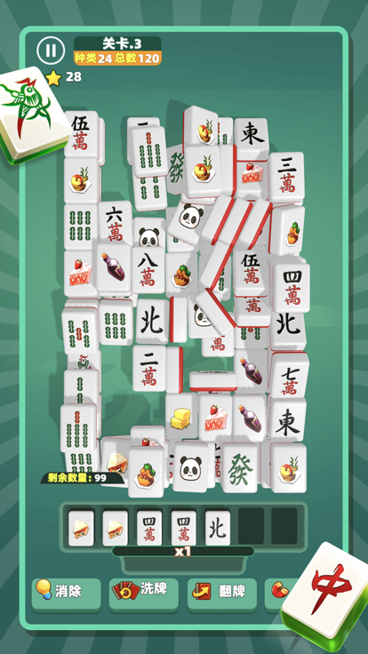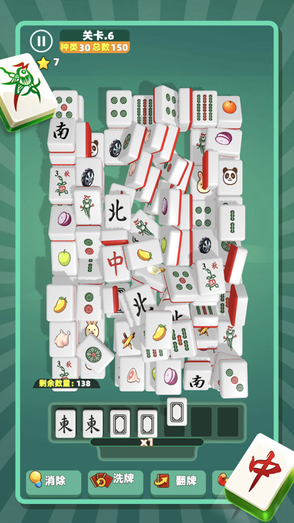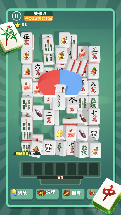 1. 传统消除模式,配对相同的麻将方块进行消除,每位玩家都能迅速掌握,完成所有挑战。