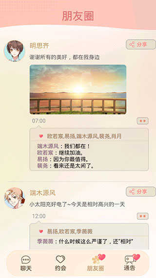 5、朋友圈界面则是为玩家们展现出游戏中各个角色的生活动态,玩家可以对这些动态进行分享点赞或者评论。