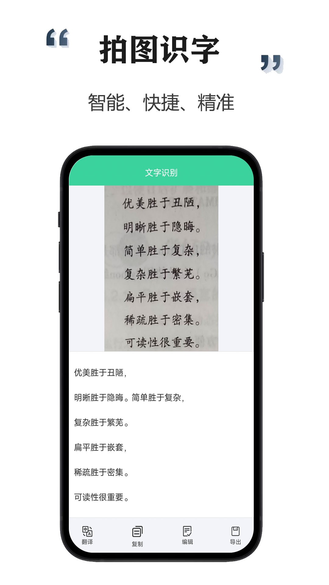 【拍照识字】全能扫描大师支持拍照识字功能,通过相机拍摄文字图片,即时提取并转换成可编辑的文字内容。