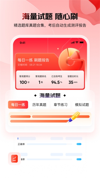 练习考场、模拟考场、真题考场,系统自动阅卷,自动批改,生成测评报告,提供个性化针对提升建议。每年考前万人大联考,模拟真实考试环境,让你提前知晓自身水平。