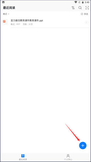 1、点击稻壳阅读器手机版首页右下角的“+”号按钮;