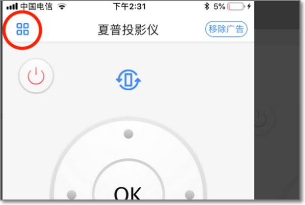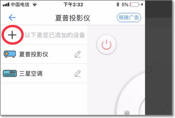3、打开app,进入主界面。左上方的按钮可以添加或切换电器设备。注意!如果是第一次使用app,则可直接进行电器类型的选择,即直接开始第四步。