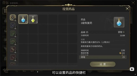 背包能够借助扩容道具来增加格数,物品可直接出售与回收,药品快捷栏可对各类药品道具进行设置。