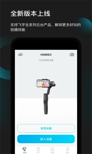 1、打开feiyuon最新版,连接蓝牙,有设备、技巧、相册和我的版块;