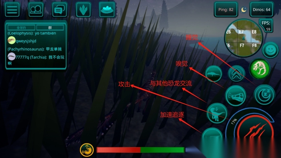 6、为了防止种间群体,需要舒适度(在食草动物中,可以)靠近另一个比你更强的恐龙物种,你会失去舒适度,你的舒适度颜色会变成红色,随着舒适度的降低,你会生长得更慢。