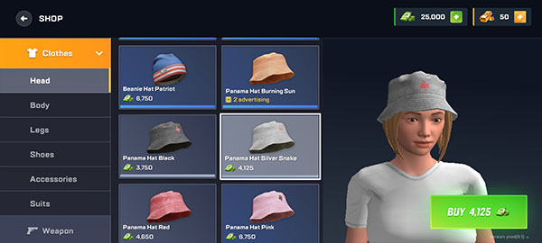 7、点击左侧的Clothes可以购买头饰、衣服、裤子、鞋子以及武器等装备。