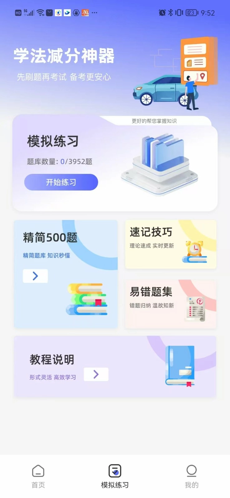 3、在学法减分神器中有模拟练习、精简500题、速记技巧、易错题集和教程说明等版块;