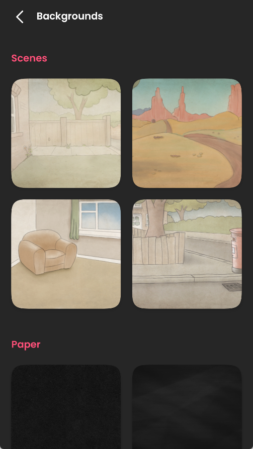 点击选择背景,可以看到有一些预设的图片,点击右下方的油漆桶图标则可以把背景变为纯色,点击相册可以从相册里添加图片,点击相机则可以拍照。
