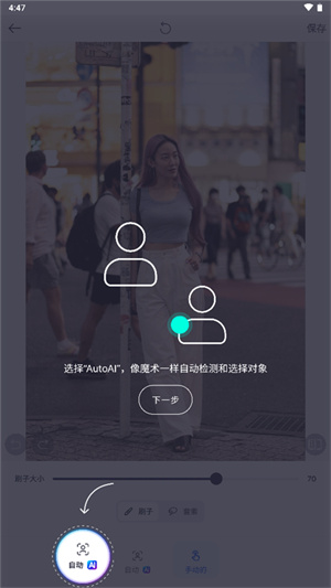 6、点击刷子,用户可以用笔画手动绘制和选择图像,并使用橡皮擦删除对象;