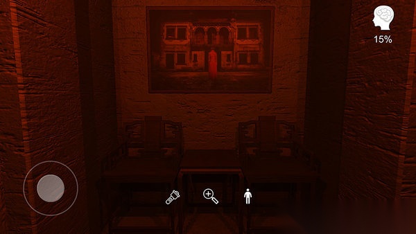 走廊探索:沿着道路一直往前走,在前面的墙壁上可以找到画1,这是一个红衣女子面向一栋建筑的照片,气氛营造的很到位,还有点儿让人害怕的感觉。