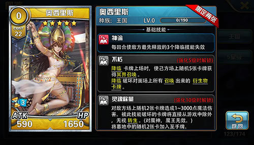 看不出来强在哪?那我来帮你回忆一下:目前唯一一个能够使对方被动型和物理型技能失效的卡牌,叫做蚀月骑士;目前唯一一个能够使对方主动施放的技能失效的卡牌,叫做易命之昭;这两者都是目前T0级别的魔族卡。而奥西里斯作为一张6合卡拥有和T0魔族同类型的技能,其优点不言而喻。虽然有次数限制,但由于降临技能普遍具有高强度且反制困难,ban掉对方3个降临技能往往能起到不小的效果。