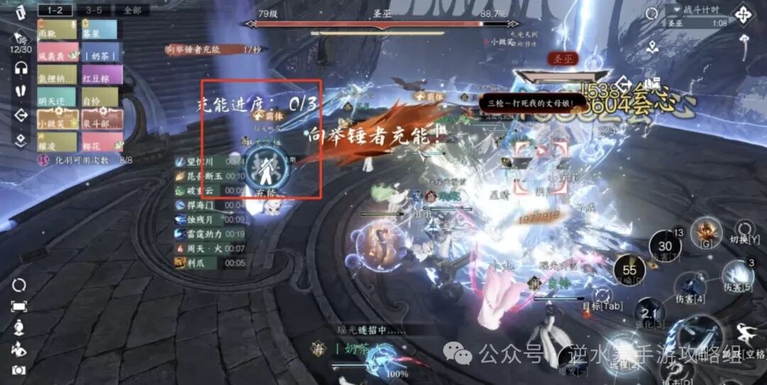 机制2:激雷悬天,BOSS将悬天之锤砸向地面,变为可拾取状态。满电能玩家拾取,其他玩家点击向他充能。
