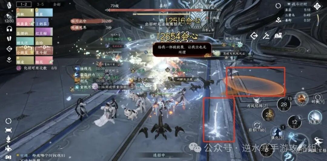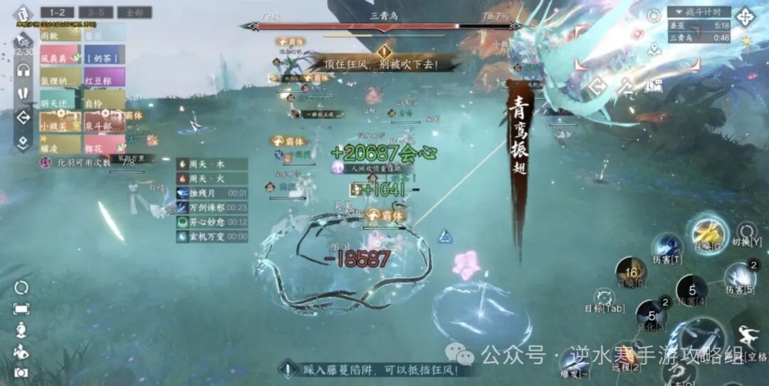 机制2:青鸾振翅,BOSS跳向后方振翅,会把所有玩家吹下悬崖(吹下可获得成就)。利用上面机制形成陷阱可以躲避,注意陷阱有伤害,等BOSS起跳后再进。