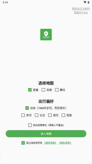 仅支持使用高德导航,百度导航SDK过大不集成,必须开启GPS,不能离线导航(可先计算路径后断开网络)。可在出行方式中选择,实现当前位置导航到目的地;如在地图首页选中有一点进行导航,默认小于两公里使用步行导航,大于两公里使用驾驶导航。可在导航设置中进行偏好设置。